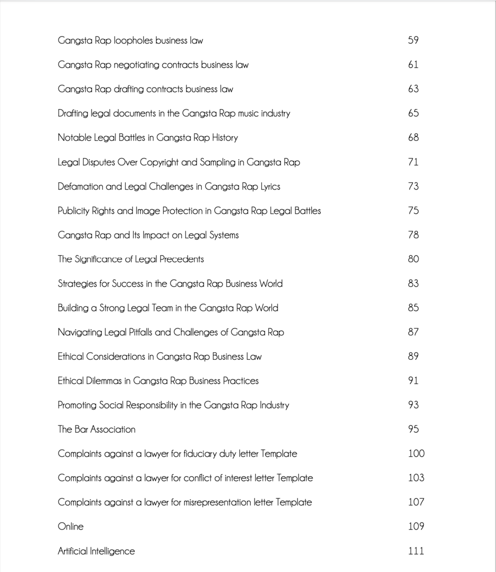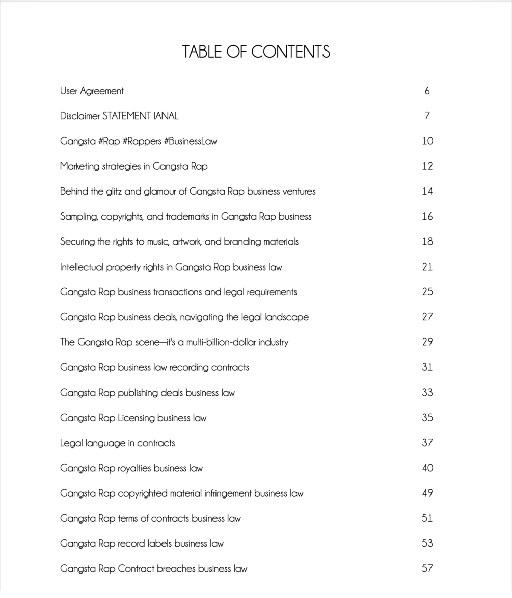 Overall, "Gangsta Rap Rappers Business Law" serves as a comprehensive guide for artists looking to launch a successful career in the music industry. By combining legal information with practical tips on marketing and branding, the book empowers artists to take control of their careers and protect their creative work. As the market for gangsta rap continues to grow, books like this will play an essential role in helping artists navigate the business side of the industry and achieve long-term success.