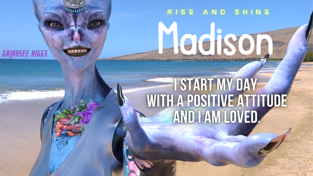 Galaxsee Higgs Inspirational Powerful Positive Affirmations. "Inspirational Powerful Positive Affirmations. "Rise and Shine Madison. I start my day with a positive attitude and I am loved." NFT on OpenSea: https://opensea.io/assets/ethereum/0x495f947276749ce646f68ac8c248420045cb7b5e/84141157572149053298526420246772327030742789386747326026096496189592198709249/