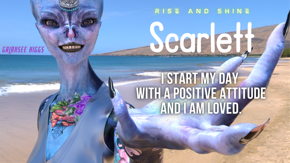 Galaxsee Higgs Inspirational Powerful Positive Affirmations. "Inspirational Powerful Positive Affirmations. "Rise and Shine Scarlett. I start my day with a positive attitude and I am loved." NFT on OpenSea: https://opensea.io/assets/ethereum/0x495f947276749ce646f68ac8c248420045cb7b5e/84141157572149053298526420246772327030742789386747326026096496193990245220353/